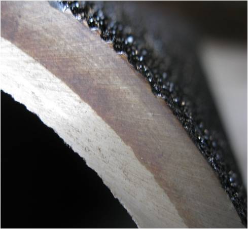 5、常规钢管内铸耐磨层复合钢管虽然较好克服了上述各种内磨管的不足,但由于生产工艺原因,在成品钢管内浇铸的高铬铸铁耐磨层难以与外层钢管形成均匀稳定的冶金结合,高强度、高脆性的内层不仅不能对整体补强,还导致结合处的边界部位极易因内应力原因出现裂纹,非结合处出现剥离脱落现象。由于内衬金属在外层低温钢管表面流动温降速度极快,导致内层金属夹渣凝固,表面光洁度较差。作为流体输送管存在粗糟内表面是不受欢迎的。