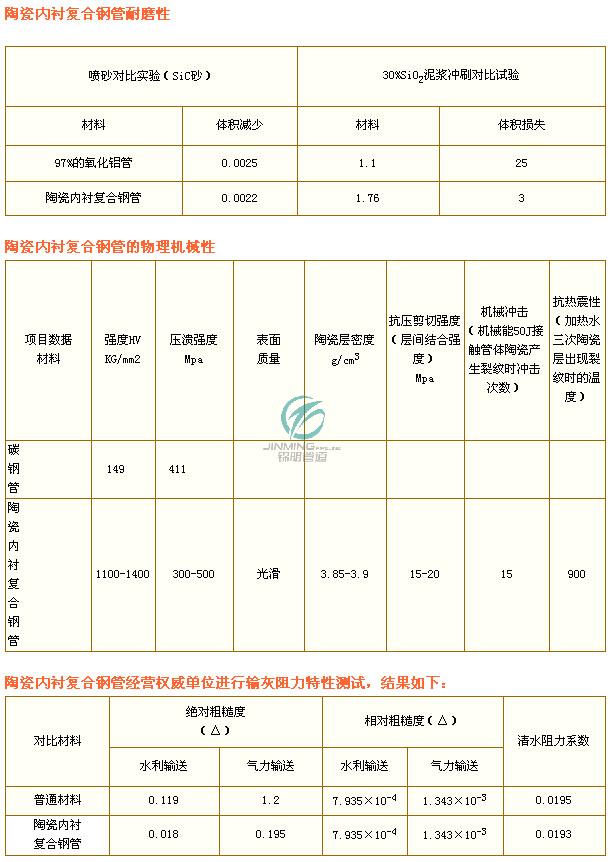 陶瓷内衬符合钢管内层为刚玉陶瓷,莫氏硬度在9.0以上,相当于HRC90以上,因此对电力、煤炭、冶金、矿山所输送的任何介质均有高耐磨性。