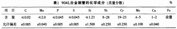 由表1 可见,9 0 4 L 合金钢是一种超低碳的Mo 含量较高的高铬镍合金钢。因进行了固溶处理,其金相组织是纯奥氏体,不含任何游离的铁素体。