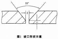 2 . 1坡 口 用手提式砂轮机打磨出如图1 所示的坡口。打 磨完后用不锈钢丝刷清理坡口,并着色检查。在施 焊前用丙酮或C C 1 清洗坡 口,组焊时应确保错边 量 ≤0 . 5 mm。